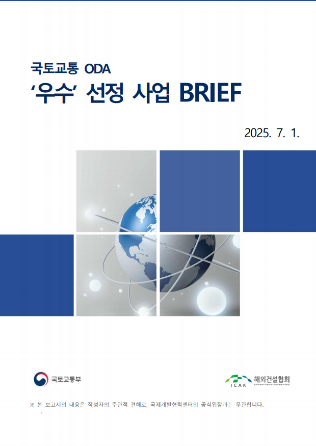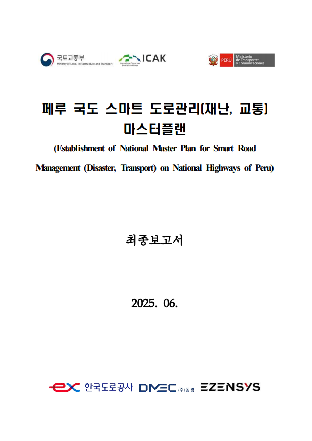 ・(사업명) 페루 국도 스마트 도로관리(재난, 교통) 마스터플랜 수립 ・(규모) 8.3억 ・(기간) 2024.07~2025.06(12개월) ・(사업지역) 페루 ・(주요내용) 스마트 도로관리 기본방향 및 추진전략 수립, 중장기 계획 도출, 중점사업별 개념설계 및 이행계획 등 마스터플랜 수립 ・(수행기관) 한국도로공사 컨소시엄(한국도로공사, (주)동명기술공단종합건축사사무소, (주)이젠시스)